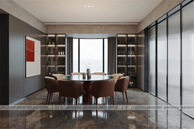 餐廳延續(xù)了客廳的無主燈設計,柜子藏光的設計,不僅起到裝飾作用,也突出空間的物品陳列。色彩分明的裝飾畫,瞬間提升居室格調。