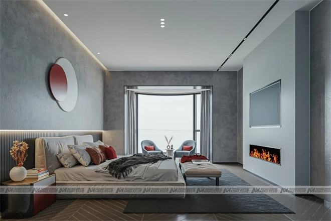 主臥以高級灰作為肌底,純粹內斂的質感給予人情緒上的安撫,注入紅色軟裝,出現(xiàn)在裝飾畫、抱枕、床頭柜上,將張揚與低調銜接和諧,凸顯優(yōu)雅格調。