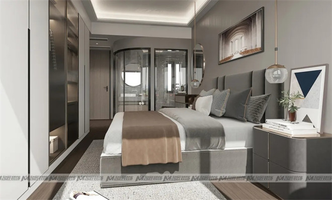 主臥低飽和的配色方式,再輔以金屬色的軟裝點綴,賦予空間深邃感及和諧感,宜家更宜居,還有一個亮點是全玻璃的衛生間設計,既節省空間又增加透光度,采用玻璃隔斷將沐浴區與梳洗區、如廁區分開,做好干濕分離