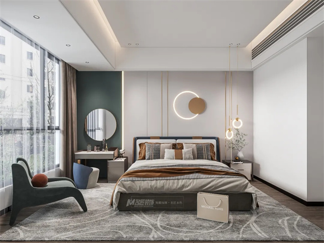 睡眠區沉靜的灰色能讓人迅速進入靜默休息的狀態;衣妝區搭配清雅的綠,能在一天的清晨中感受自然的氣息。