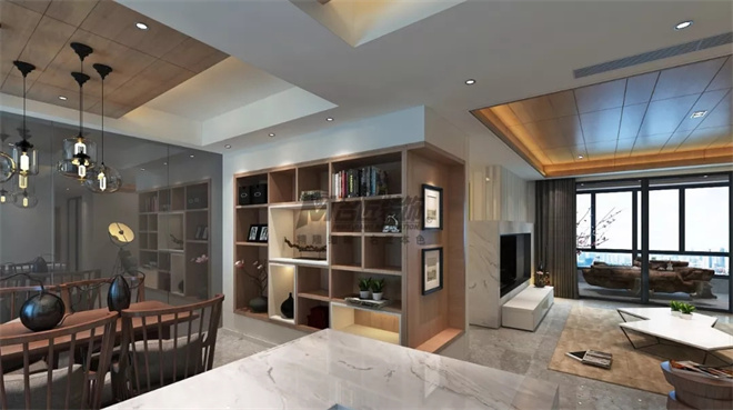 客廳與餐廳的銜接妙在用一組裝飾柜鑲嵌在墻的轉(zhuǎn)角處,擴(kuò)大了過(guò)道面積又不失美觀。