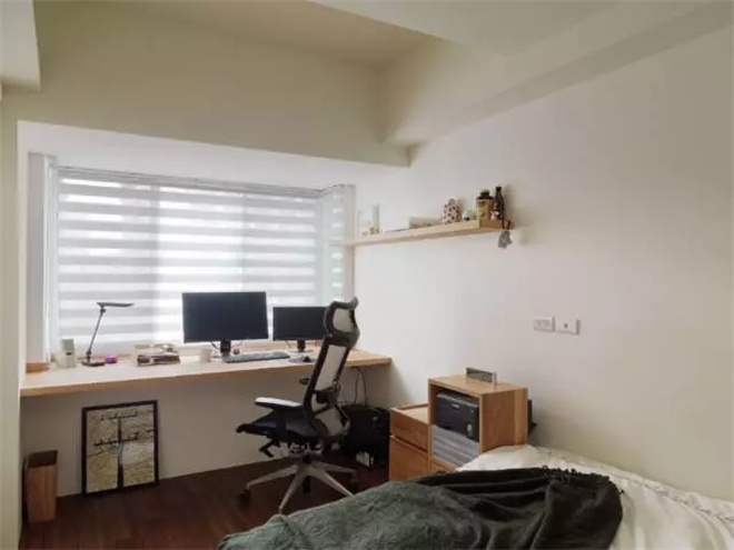 臥室的窗臺下,一個木質擱板就成為簡單的書桌,這種做法比放一個現成的桌子更加節省空間