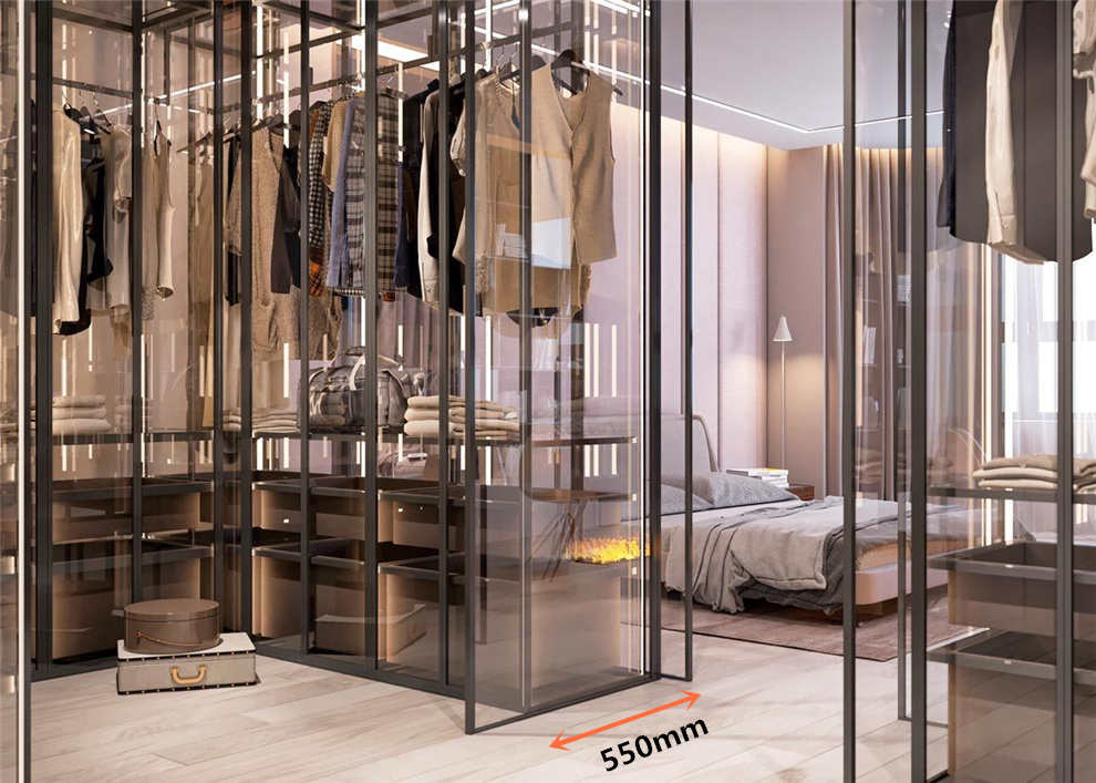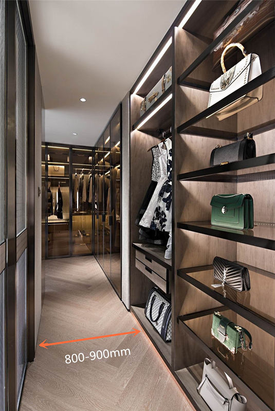 衣帽間寬度=走道寬度+衣柜深度。800-900mm走道寬較為舒適,既能自由走動,衣物更換時手腳的伸展也不至于太拘束。